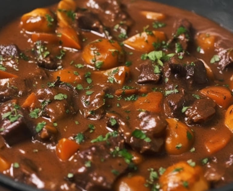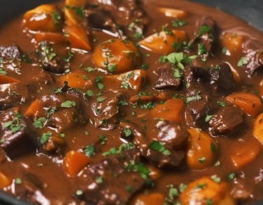 French Beef Bourguignon (Bœuf Bourguignon) is a rich and hearty French stew made by slow-cooking tender beef chunks in a deep, flavorful sauce of red wine, beef broth, and aromatic herbs. Originating from the Burgundy region of France, this dish is a perfect blend of French culinary tradition and rustic comfort food. The beef is first seared to lock in its juices, then simmered slowly with onions, carrots, celery, and garlic. The addition of red wine infuses the dish with a deep, complex flavor, while butter, tomato paste, and flour help create a luscious, velvety sauce. Fresh herbs like thyme, rosemary, and bay leaves enhance its aromatic depth. Typically served with buttered potatoes, crusty French bread, or creamy mashed potatoes, Beef Bourguignon is a classic bistro-style dish perfect for special occasions or cozy family dinners. Its rich, savory, and melt-in-your-mouth texture makes it a timeless favorite in French cuisine.